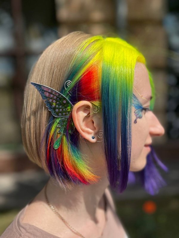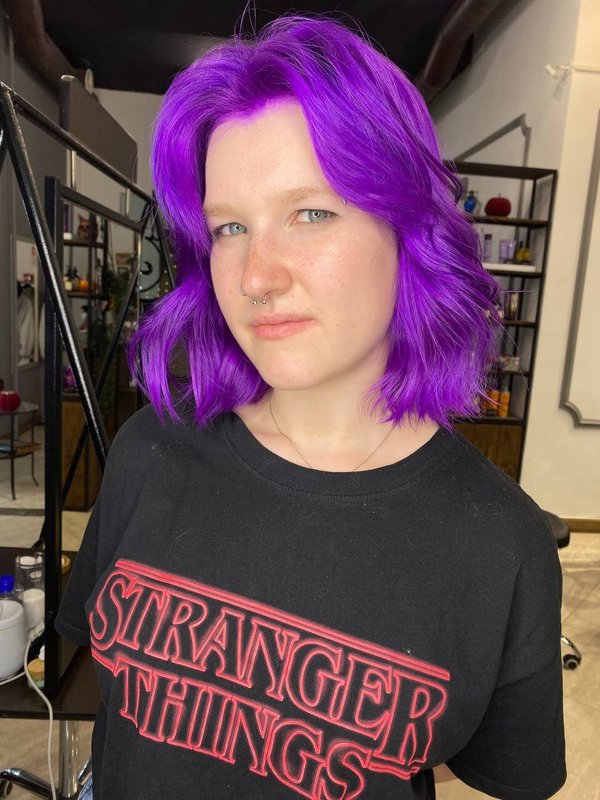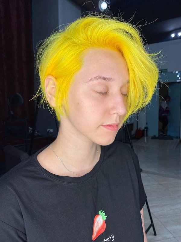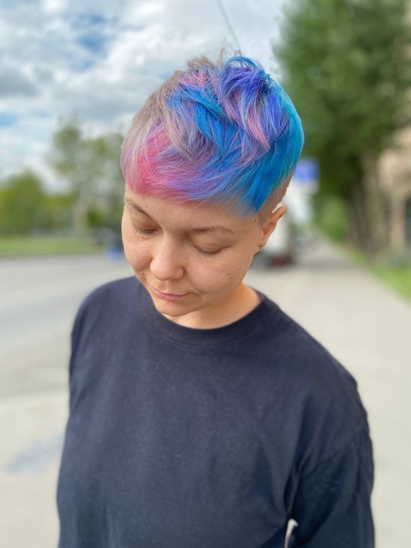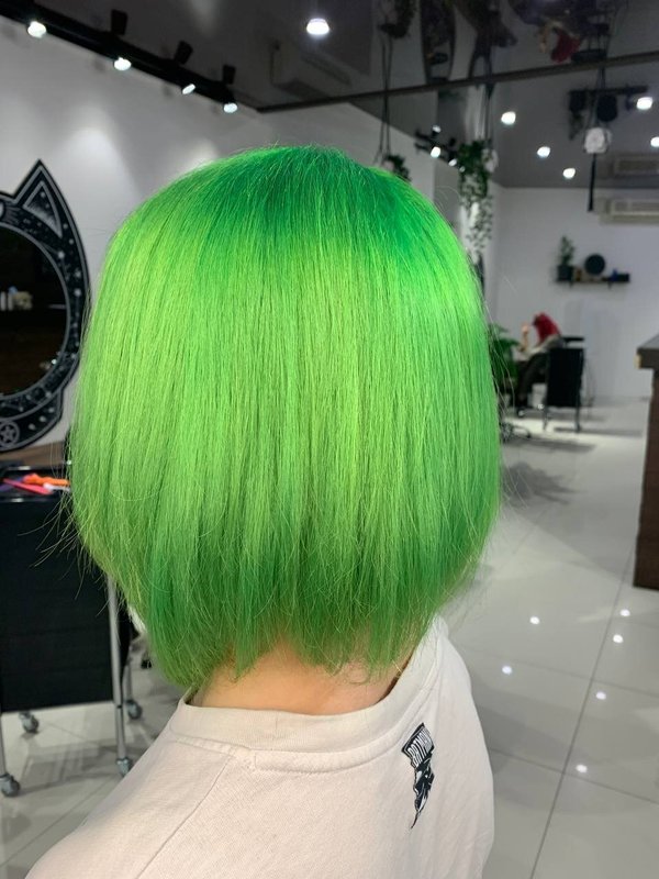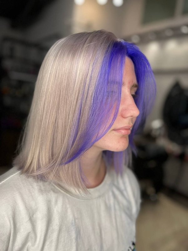 Через полтора месяца решила попытать счастья у топ мастера-стилиста, заплатить чуть больше, чтобы моими волосами занимался более опытный человек. Когда записывалась, уже просила блонд. Думала, мне подчистят цвет по длине, избавят наконец от пятнистого окрашивания, с которым я ушла в прошлый раз. После семи часов в салоне, мне почему-то сделали темно-серый цвет с синими пятнами у корней, уверили, что он в дальнейшем подсмоется и будет светлее. В этот раз вместе со стрижкой получилось также 12 тыс рублей. Напоминаю, что у меня короткие волосы выше плеч с выбритыми висками и затылком. Сделали ещё какой-то уход, но волосы все равно были в ужасном состоянии. После первой же помывки головы начали зеленеть. По совету мастера пользовалась нейтрализующими шампунями, но они исправить ситуацию не смогли.