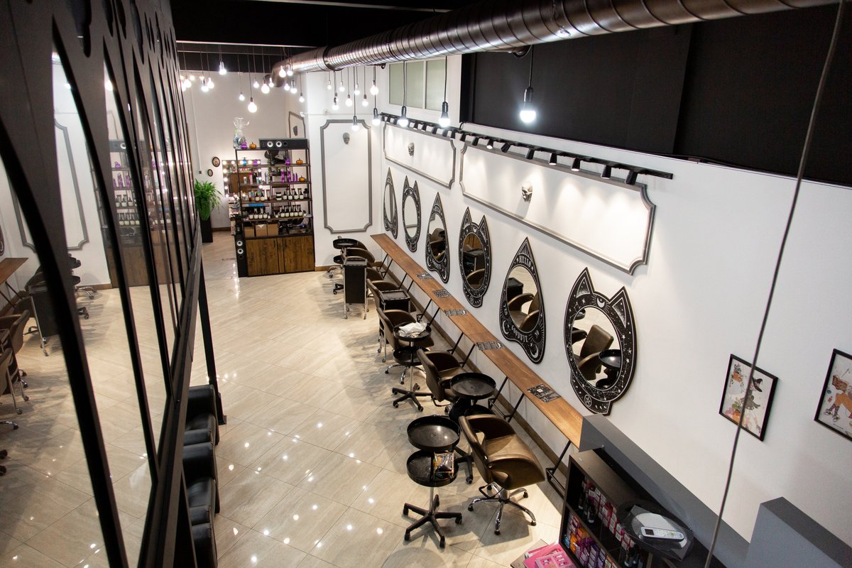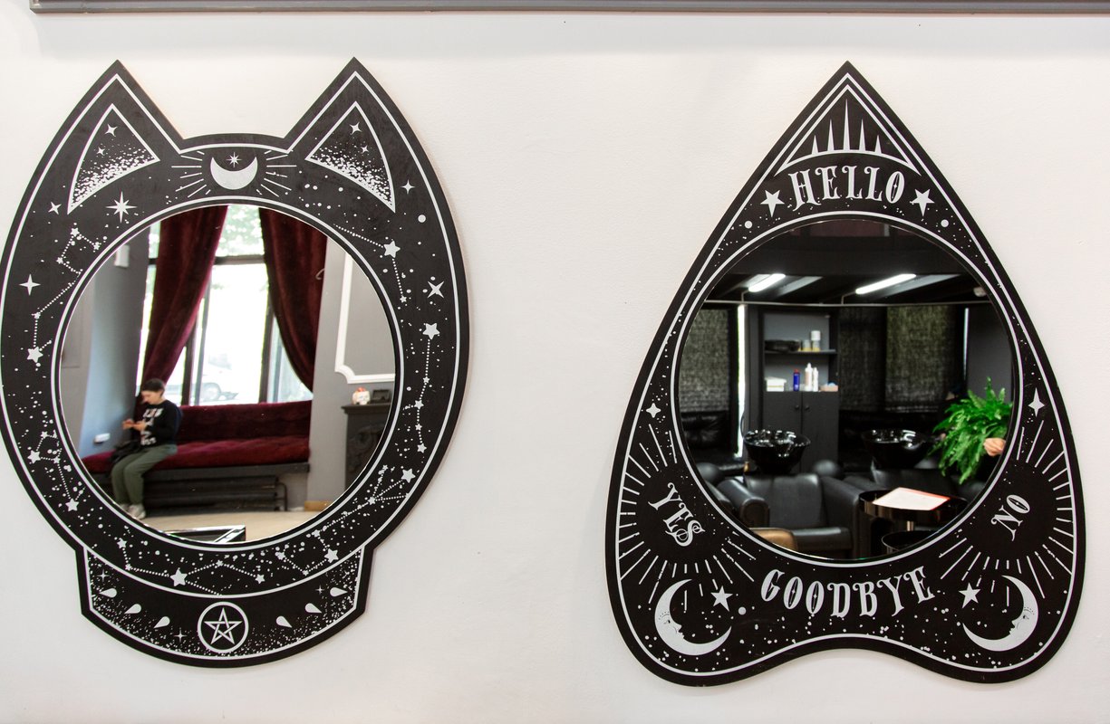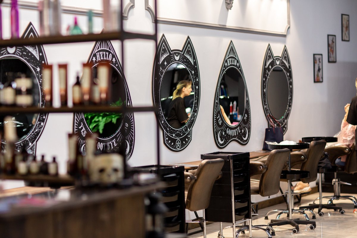 Салон производит сразу очень приятное впечатление. Атмосферный интерьер, зеркала, музыка, всякие мелочи типа статуэток кошек, котелков, шляп.